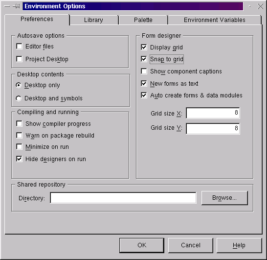 The dots are indicative of a grid that components "snap to" when placed on the form, to aid in the consistent alignment (each grid unit defaults to 8 pixels for height and width). You can customise the Form Designer, including changing the granularity of the grid and whether it is active or visible on the Preferences page of the Environment Options dialog (see Figure 5), which can be found on the Tools menu.