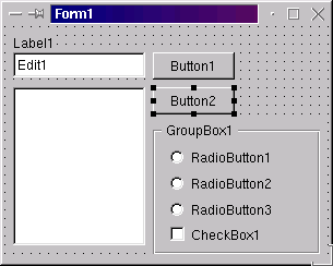 Single-clicking a component on the Form Designer will select it (the button with the caption Button2 is selected in the screenshot above), allowing you to move it, resize it or modify its properties (see Figure 7). You can also select multiple components simultaneously, either by lassoing them (drag out a rectangle on the Form Designer which touches or encloses all components to select) or by single-clicking the first one and Shift-clicking all the rest (hold the Shift key down and single-click each subsequent component).