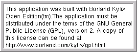 You will also notice that, as the program starts, the Kylix Open Edition banner that appears as a modal, border-less stay-on-top window and lasts three seconds (shown in Figure 11). Note that trying to modify this banner contravenes the Kylix Open Edition license agreement, but it is useful to know that clicking it makes it disappear, and that the -ns command-line parameter can be passed to any Open Edition application to prevent the dialog from appearing at all. From the IDE, you can specify command-line arguments by choosing Run | Parameters... and entering them into the Parameters field.