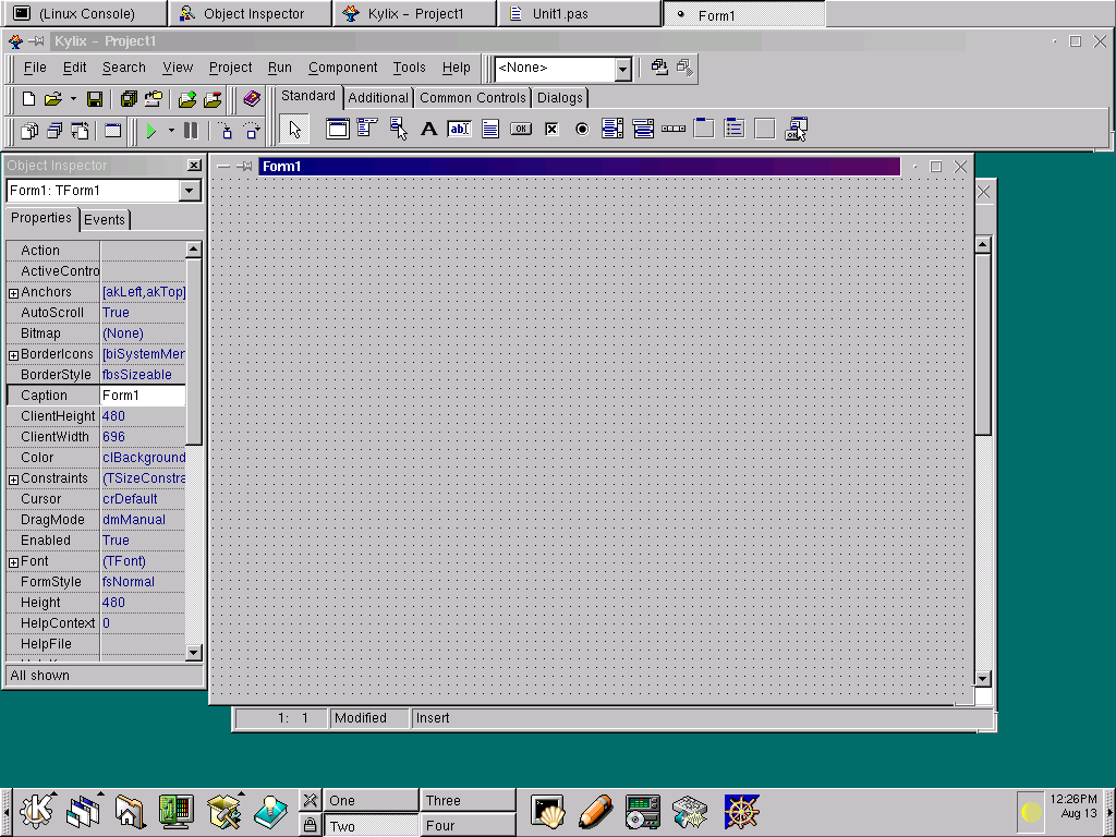 Unless you are designing a console application, most Kylix applications will have at least one form in them. Each form is visually designed using the Form Designer by having components placed on it whose initial property values are specified in the Object Inspector. You can see a blank Form Designer (meaning without any components placed on it) in the IDE screenshot. It is the large window with a caption of Form1 and with dots all over it.