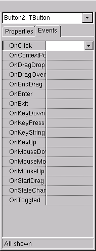 Just below the instance list, you can see that the Object Inspector has two tabs, and we are currently on the Properties tab. The other tab (Events, shown in Figure 8) shows all the events that might occur to the selected component. This is the primary mechanism for building Kylix applications; you write code that executes in response to component events (in routines called event handlers). For example, when the user presses a TButton component, its OnClick event is fired. Your OnClick event handler for the button can show a form, launch another application, terminate the application or whatever you choose.
