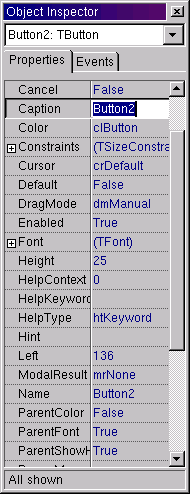 As well as allowing the properties to be set, the Object Inspector also tells you the name of the component and its type. The instance list at the top of the Object Inspector (so-called because it lists all component instances on the Form Designer, allowing you to select them) shows the type of the component, preceded by its name. The component's name can also be seen further down the Object Inspector as the value of the Name property. Since it shows up as a property on the Object Inspector, you can change the component's name just as you would any other property.