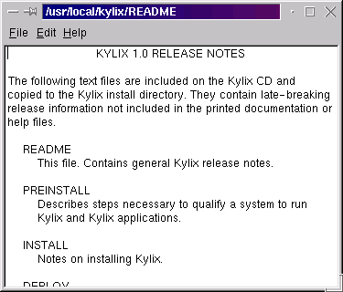 Once Kylix is installed, you should restart X to get all the menu items set up correctly, and make sure you are logged in as a normal user. More helpful information about Kylix can be found in /mnt/cdrom/README and information on deploying your Kylix applications is in /mnt/cdrom/DEPLOY.