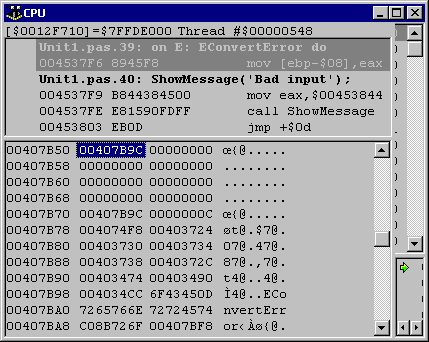 This will dump the memory starting four bytes before the address held in EAX, and so show the heap block prefix DWord, followed by the object's instance data. The first DWord of instance data will be the address of the VMT (the class reference). The memory dump pane will look like Figure 8. You can see it has a value of $21E.