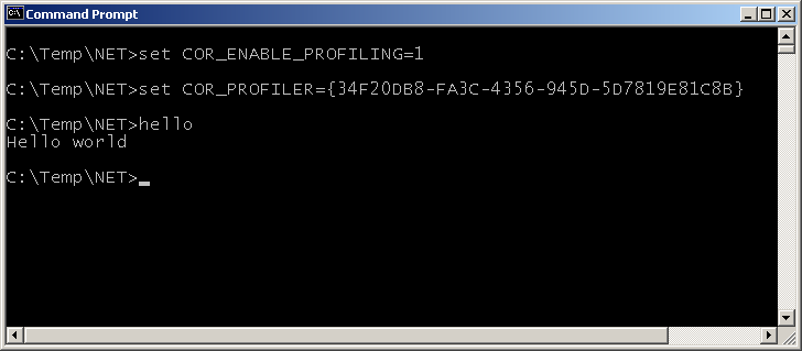 For example to enable the sample profiler from above using its ProgID, and profile a trivial Hello World type application, you could do this: