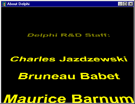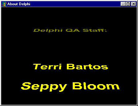 The remaining eggs are invoked through the About box. If you do not have OpenGL installed, the credit lists will be simple scrollers, much like those from Delphi 4.